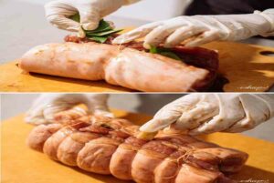 Thịt rửa thật sạch, cạo lông, dùng giấy chuyên sử dụng hoặc rẻ khô lau thật khô miếng thịt. Nhất là phần bì phải luôn thật khô ráo .